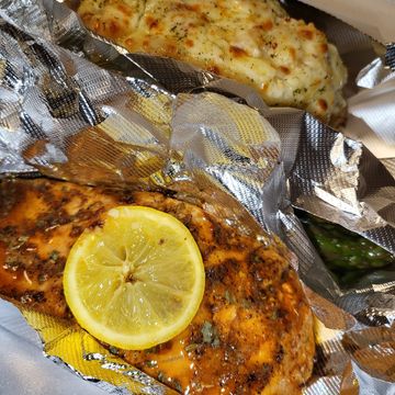 Pictured above: Roasted Garlic & Lemon Salmon filet with Seafood Loaded Potato and Asparagus